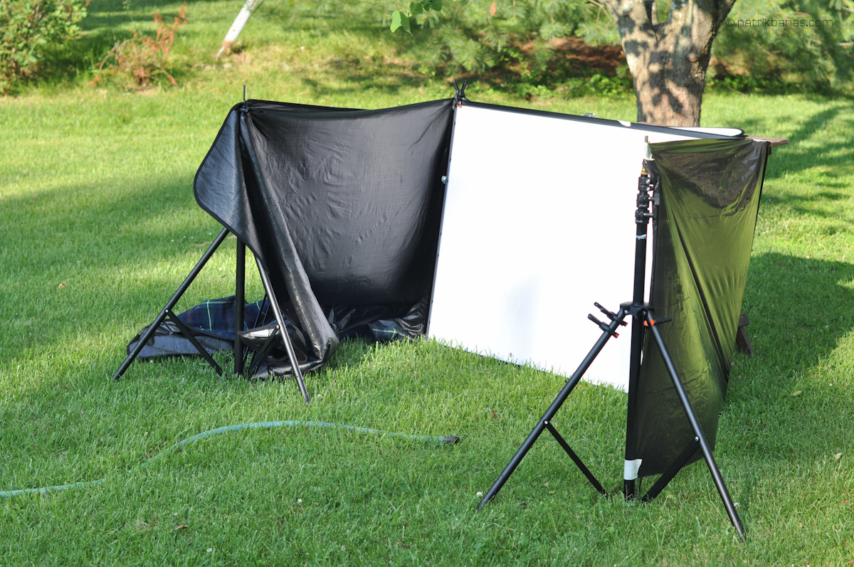Set up was actually pretty easy. White background, black surroundings (to get that nice black edges) – as you can see at the photos below. What you cannot see (as I’ve already packed it) was the camera on the tripod. Camera setup at f11, shutter speed 1/4000 (very bright day, I told you! :), ISO 200 (as low as possible). Monika was splashing and “moving” water (directly from the hose or throwing water around from the bowl, creative opportunities are endless) and I was shooting in continuous mode… Battle of the titans is then composite of three different splashes.