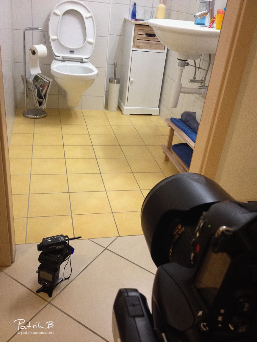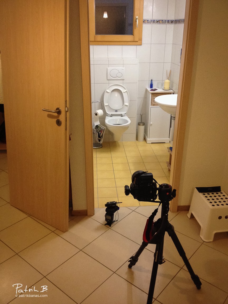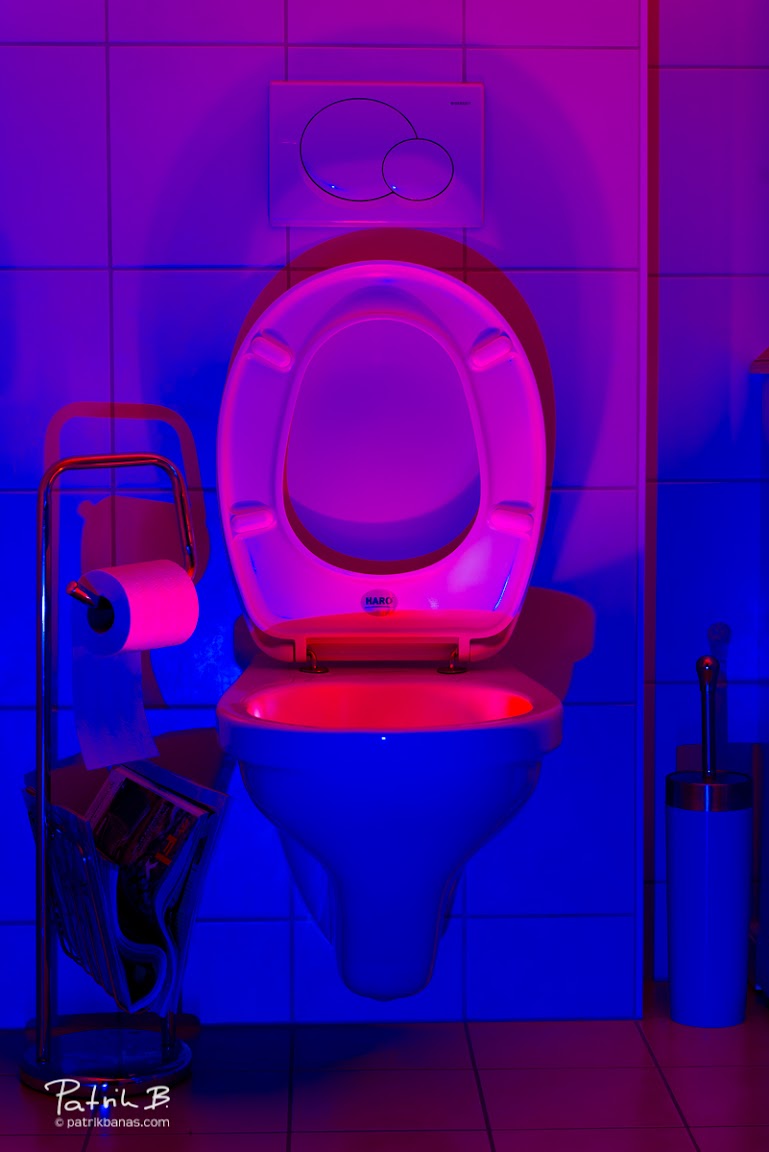 Dva blesky. Jeden s modrým filtrom – nasvietenie spredu so 1/4 výkonom a druhý s červeným filtrom schovaný v záchode (viď nižšie) s 1/2 výkonom. Fotoaparát Nikon D800 s 24-70 objektívom, clona f/5,6 na 1/200 sekundy.