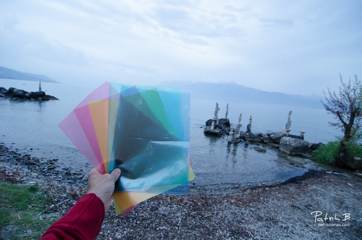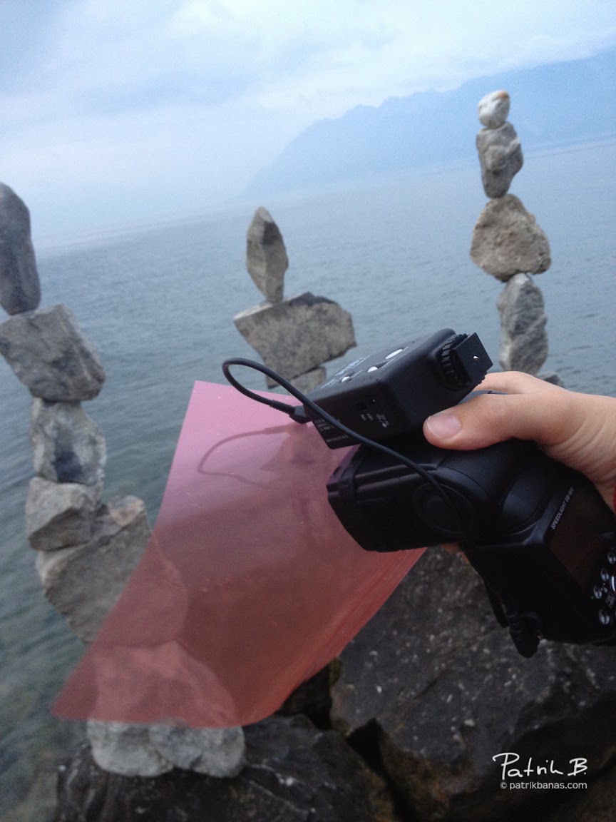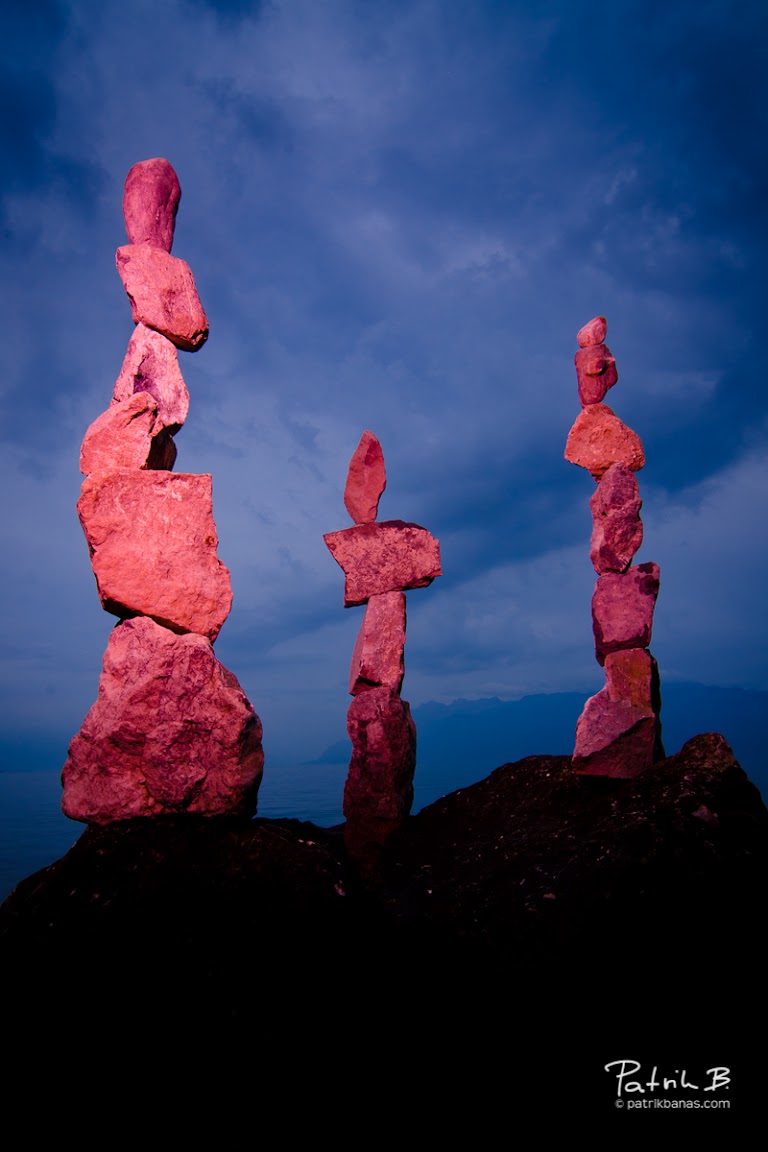 …Ženevského jezera mě zaujaly tyto “kamenné sloupy”. Někdo si hrál a velmi zajímavě na sebe narovnal kameny. Nejprve jsem si myslel, že to je nějaká umělecká kompozice s použitím lepidla, ale opak byl pravdou. Byli na sebe vážně jen naskládané. Uložil jsem si místo “do paměti” a podvečer jsem se vrátil a doufal, že to ještě nikdo nesundal. Chválabohu, Švýcaři jsou velmi disciplinovaný národ a všichni kolemjdoucí ocenili kompozici a nechali ji tak – k mé velké radosti. Vyzkoušel jsem si několik různých záběrů, ale nejvíce mě zaujal záběr zdola, oproti krásné kobaltově modré, večerní obloze, která díky blížící se bouřce měla velmi dynamický náboj. S fotoaparátem se širokoúhlým objektivem 11-16mm – samozřejmě takto v podvečer už na stativu – jsem zvolil clonu f/16 a objektivem jsem zamířil na oblohu. Můj expozimetr na fotoaparátu mi vzápětí prozradil, že ta správná expozice s touto clonou bude při 1/4 sekundy. Už ale ráno mi utkvěl v hlavě nápad, že některé z těchto sloupů by mohly vypadat velmi zajímavě, kdybych je barevně osvětlil zepředu, oproti obloze (a to jsem ještě nevěděl, že mi bouřka přinese takovou krásnou oblohu!). Jelikož jsem si ale zapomněl do výbavy hodit svou sadu barevných filtrů, poradil jsem si velmi jednoduše – navštívil jsem lokální papírnictví a přinesl si několik obyčejných barevných kancelářských obalů.
