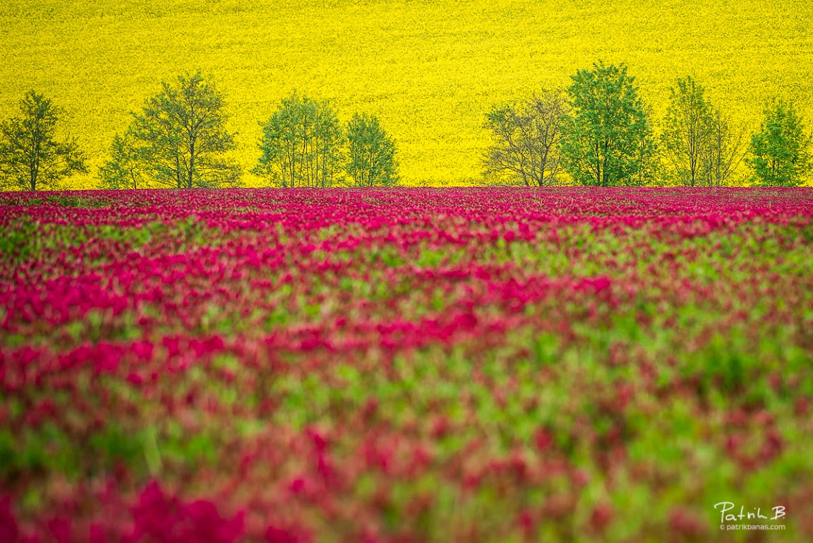 When mother Nature paints, we can just watch observe and get inspired… And I loved to observe this beauty few weeks ago, near Benešov (close to Prague), Czech republic… Canola seed fields in the background with an extra bright clover field in the foreground…