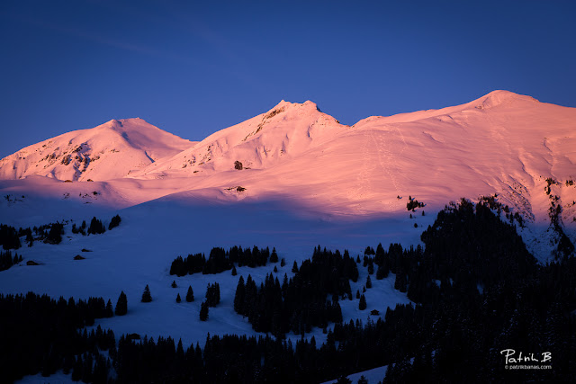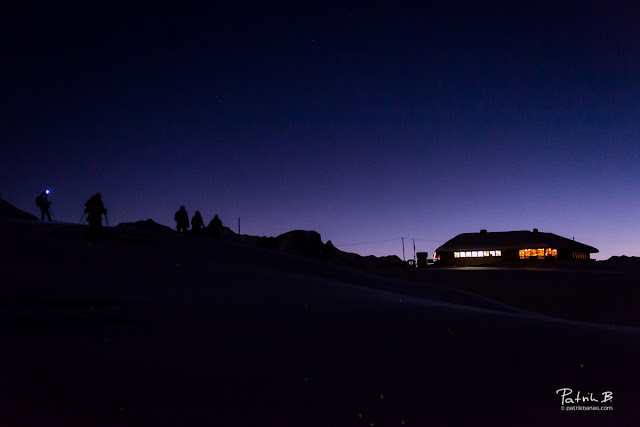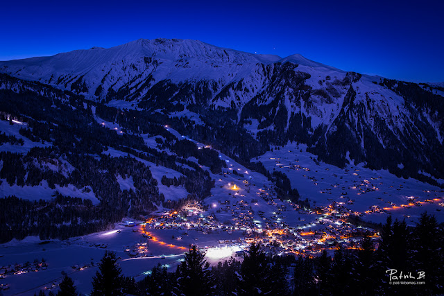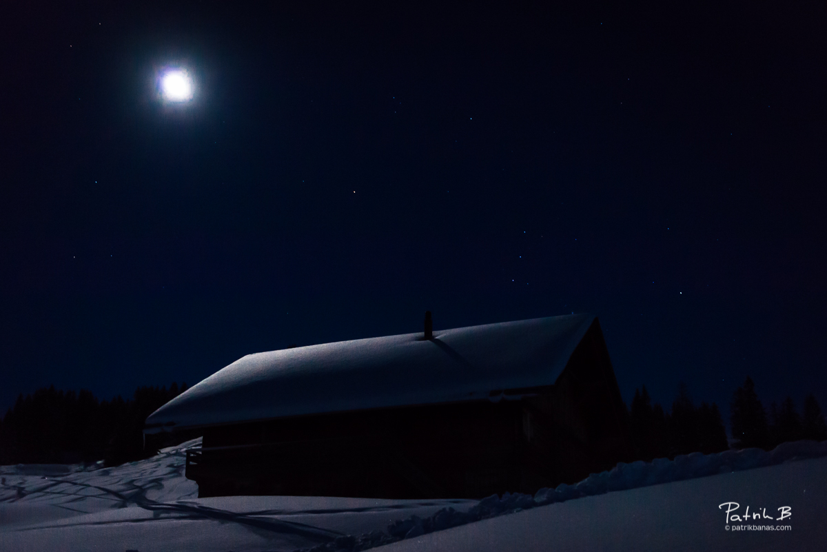 Kompozícia 30 záberov, každý záber bol exponovaný 4 minúty pri clone f/11 a ISO 100. Všetkých 30 záberov otvorených zvlášť ako vrstva vo Photoshope a spojené cez blending mode “Lighten”. Je skvelé vidieť tie biele svetelné čiary hore na kopci – to boli svetlá snežného ratráku, čo tam jazdil celú noc! 😉