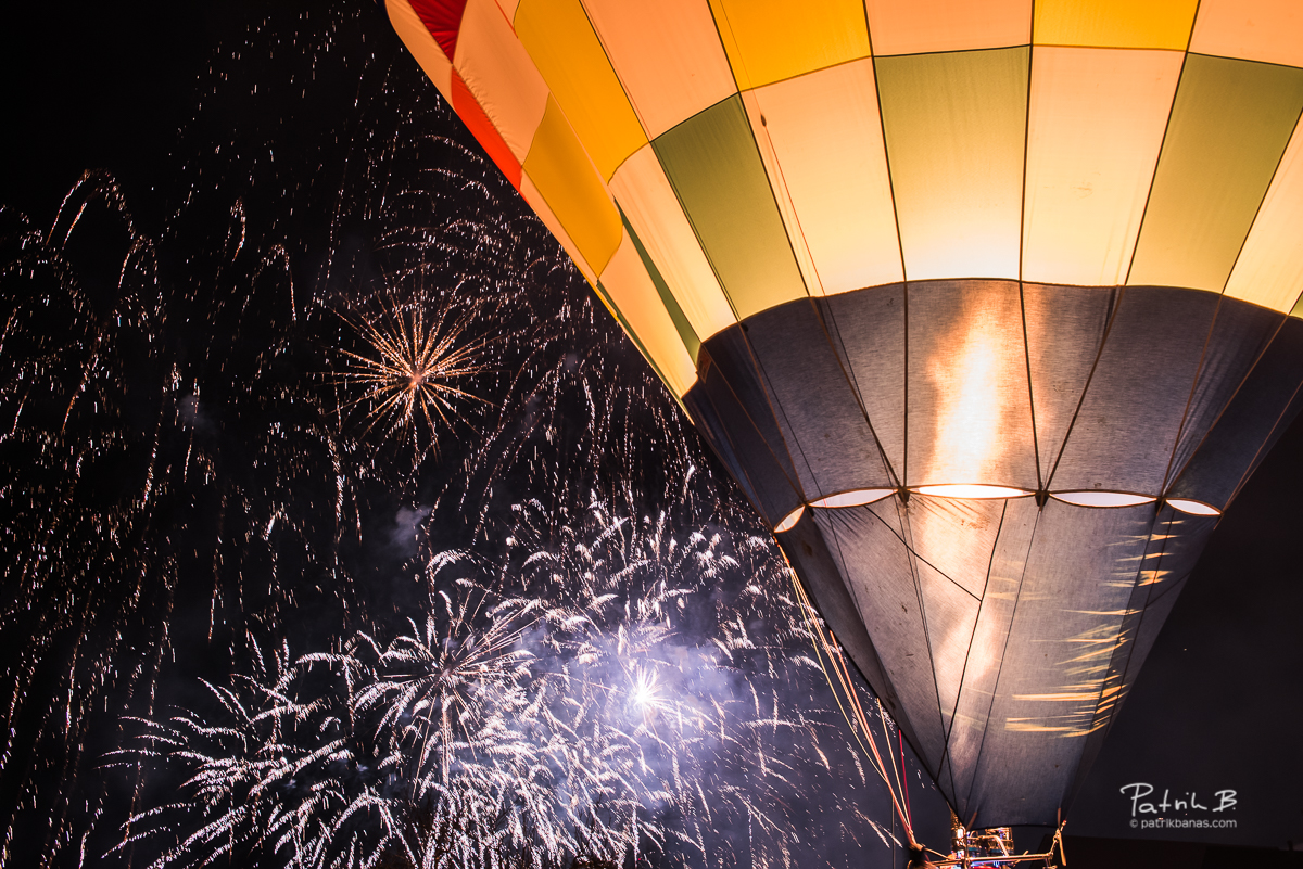 Zvyšok výletu už bol o zachytení správneho momentu pri správnej expozícii! Musím priznať, že som bol prekvapený z toho aký veľký rozdiel bol medzi správnou expozíciou balónu osvieteného z dostupného svetla a balónu osvetleného zvnútra s blčiacim horákom. Bolo to dokonca pár sekúnd, ináč som mal na fotke len oranžovú ohňovú guľu 😉 Show bola nádherná, balóny dokonca púšťali oheň do rytmu lokálnej dychovky (! skúste toto skoordinovať!), prileteli aj parašutisti s obrovskými “prskavkami”, ktoré púšťali nádherné iskry (a bolo to nemožné nafotiť, tak som to vzdal a len sa kochal). No a nakoniec samozrejme krásny ohňostroj, ktorý mi pekne zvýraznil pozadie za balónmi. Úplna pastva pre fotografove oči! 😉